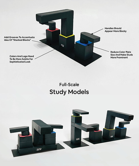 During ideation, my team explored various faucet designs. I focused on the 8” widespread faucet, inspired by Lego’s adult sets,